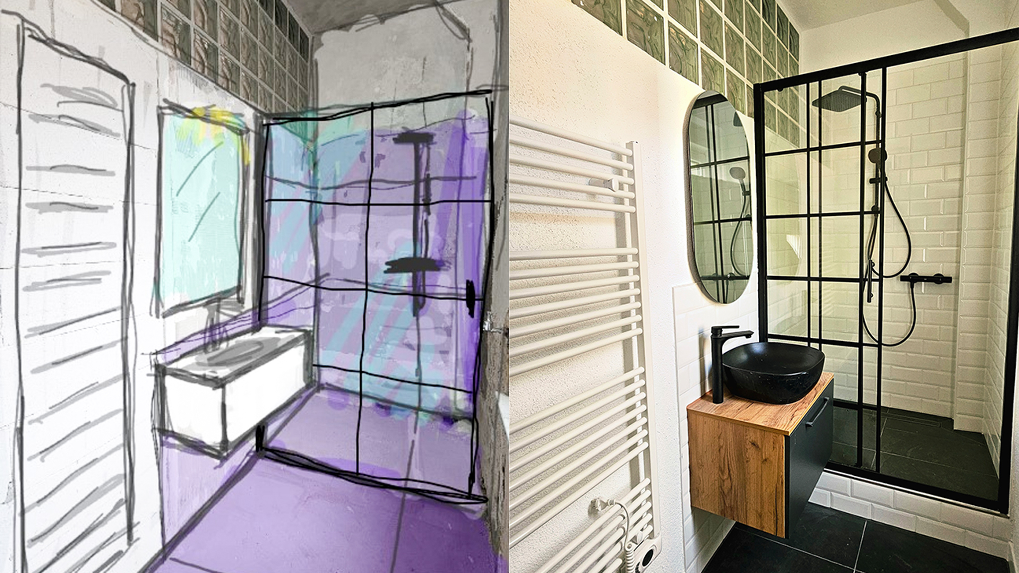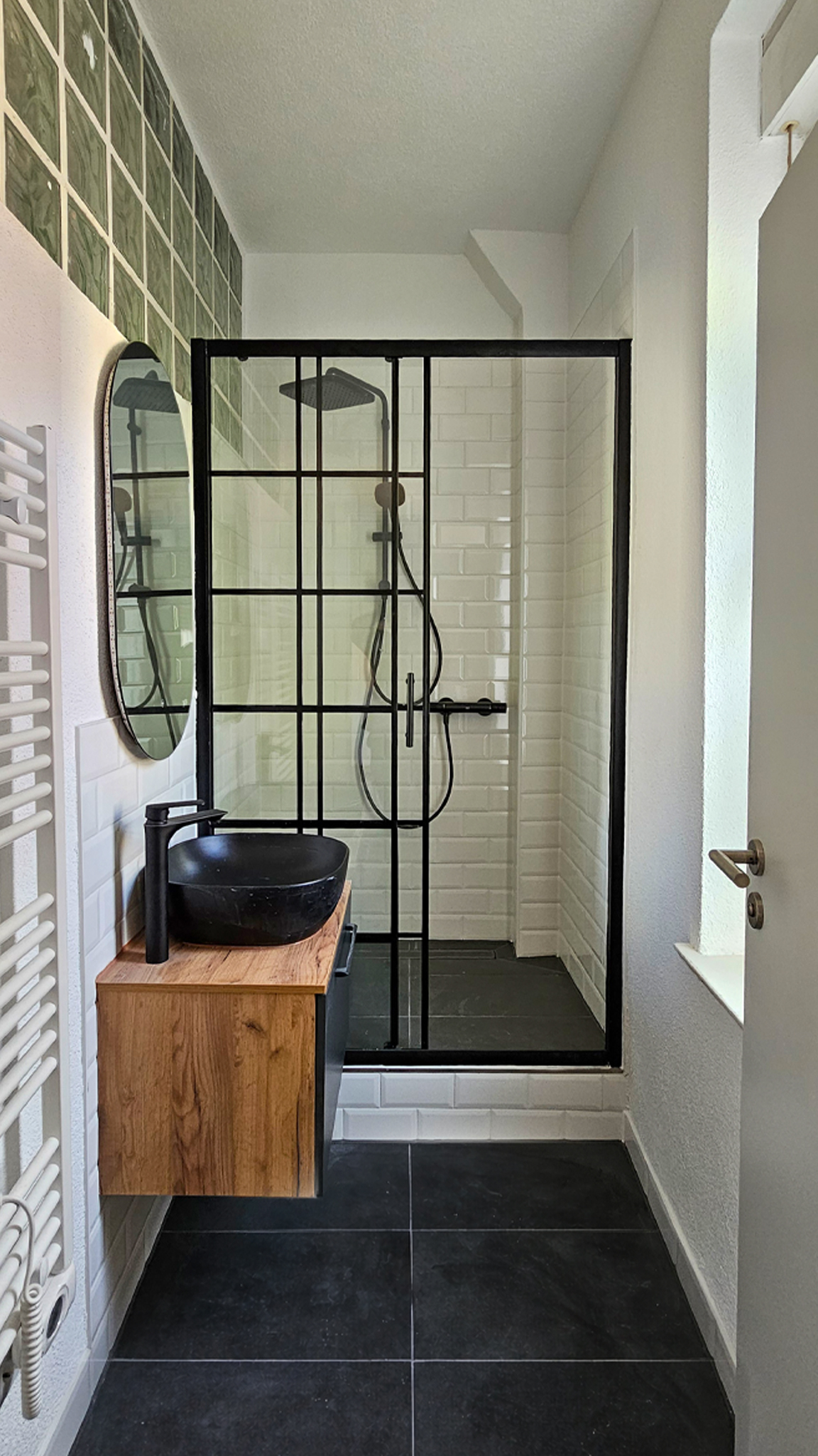 Beide Badezimmer wurden vollständig zurückgebaut und neu aufgebaut. Neue Leitungen, Abdichtungen und Oberflächen sorgen für eine langlebige und funktionale Basis. Die Gestaltung verbindet klare Linien mit kontrastreichen Materialien. Schwarze Armaturen, eine strukturierte Duschabtrennung und sorgfältig ausgewählte Fliesen erzeugen ein modernes Gesamtbild. Trotz der kompakten Grundrisse wirken die Räume ruhig und hochwertig.