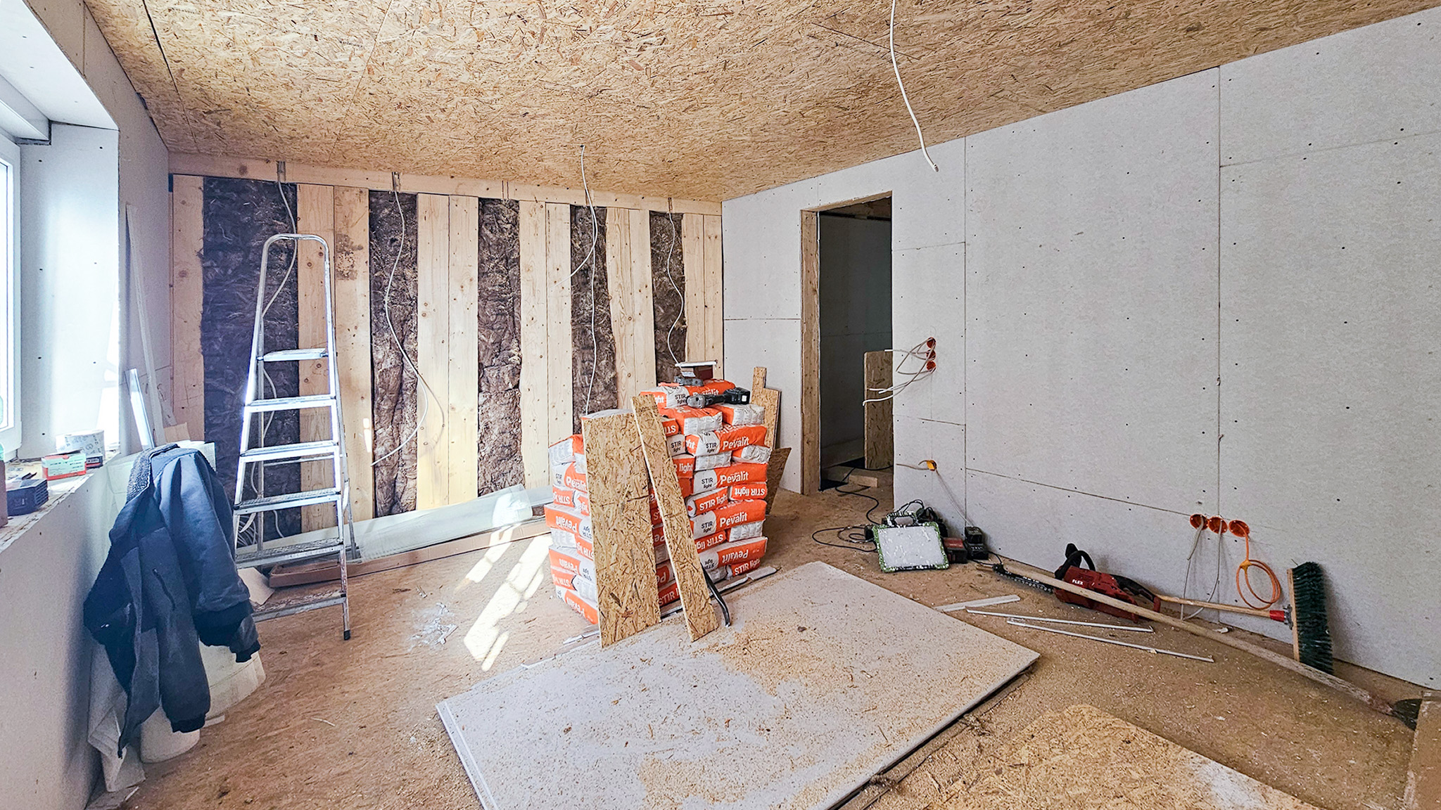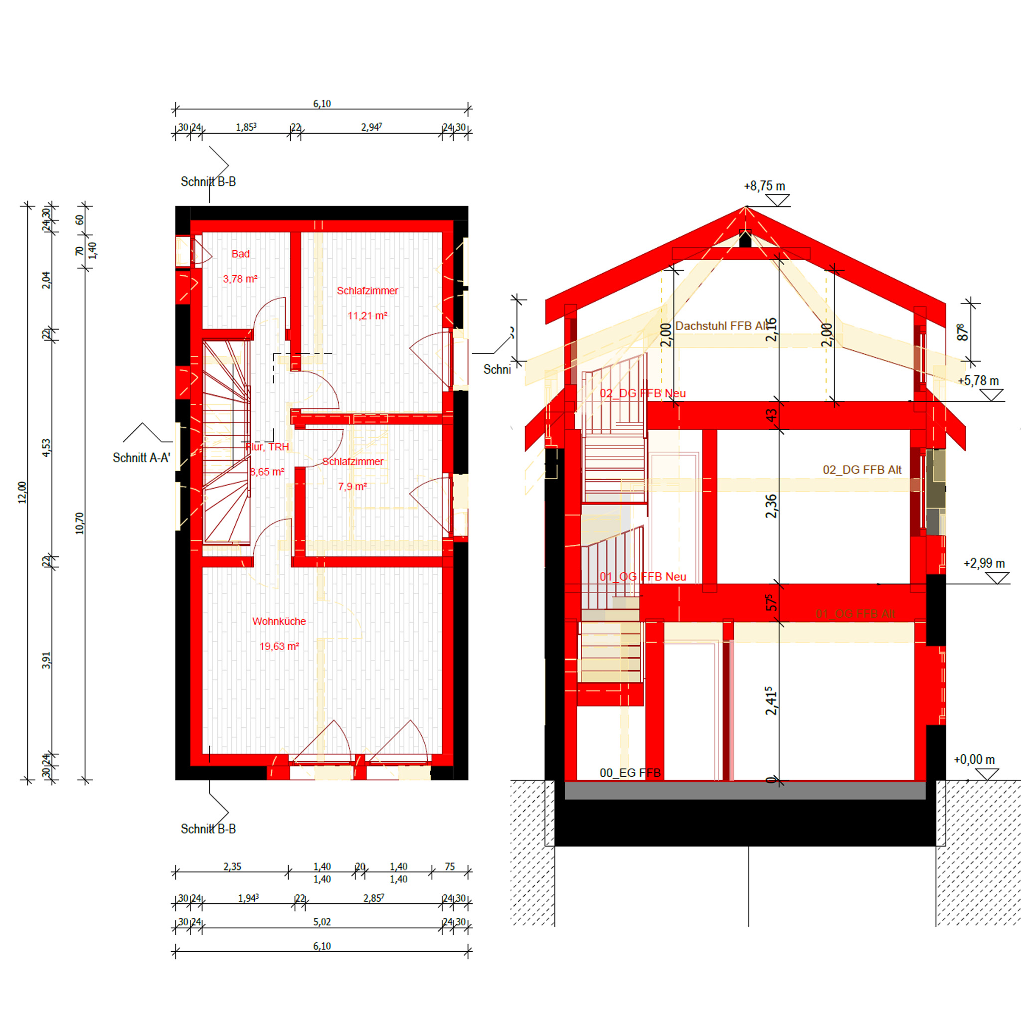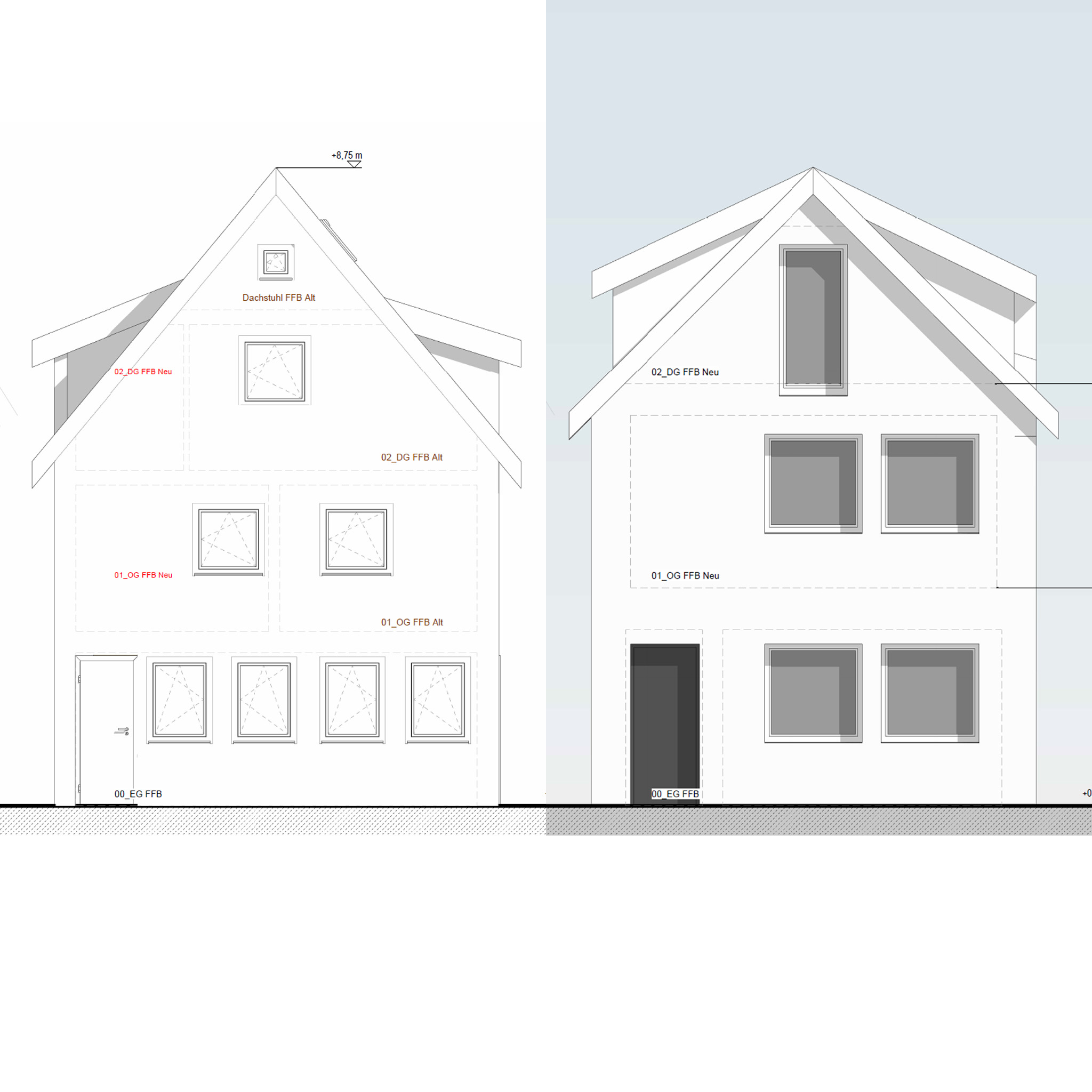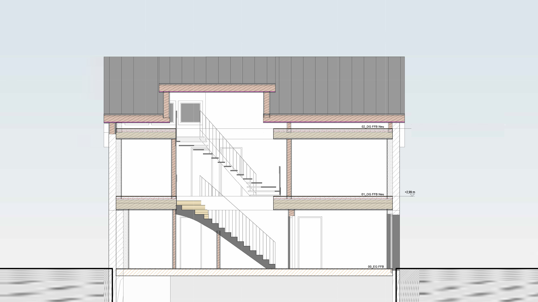 Lediglich Teile der Außenmauern blieben erhalten. Das Gebäude wurde anschließend vollständig neu aufgebaut. Zwei neue Gauben erweitern das Dachgeschoss und sorgen für mehr Licht sowie zusätzlichen Wohnraum. Die ursprünglichen Deckenhöhen von lediglich ca. 2,10 m entsprachen nicht mehr heutigen Anforderungen. Daher wurde die Höhe des Dachstuhls konstruktiv neu organisiert und auf die Geschosse verteilt, um zeitgemäße Raumhöhen zu schaffen.