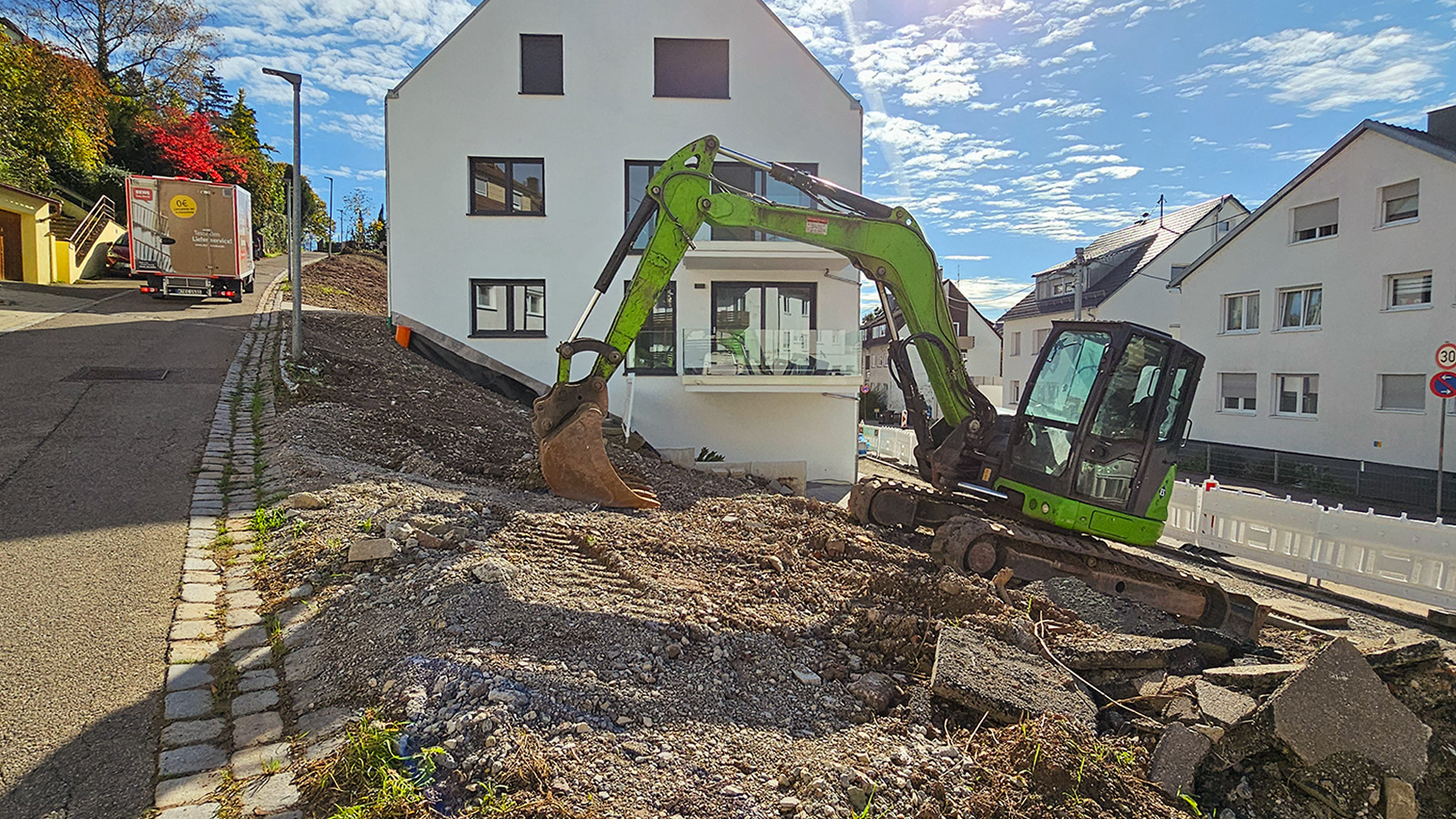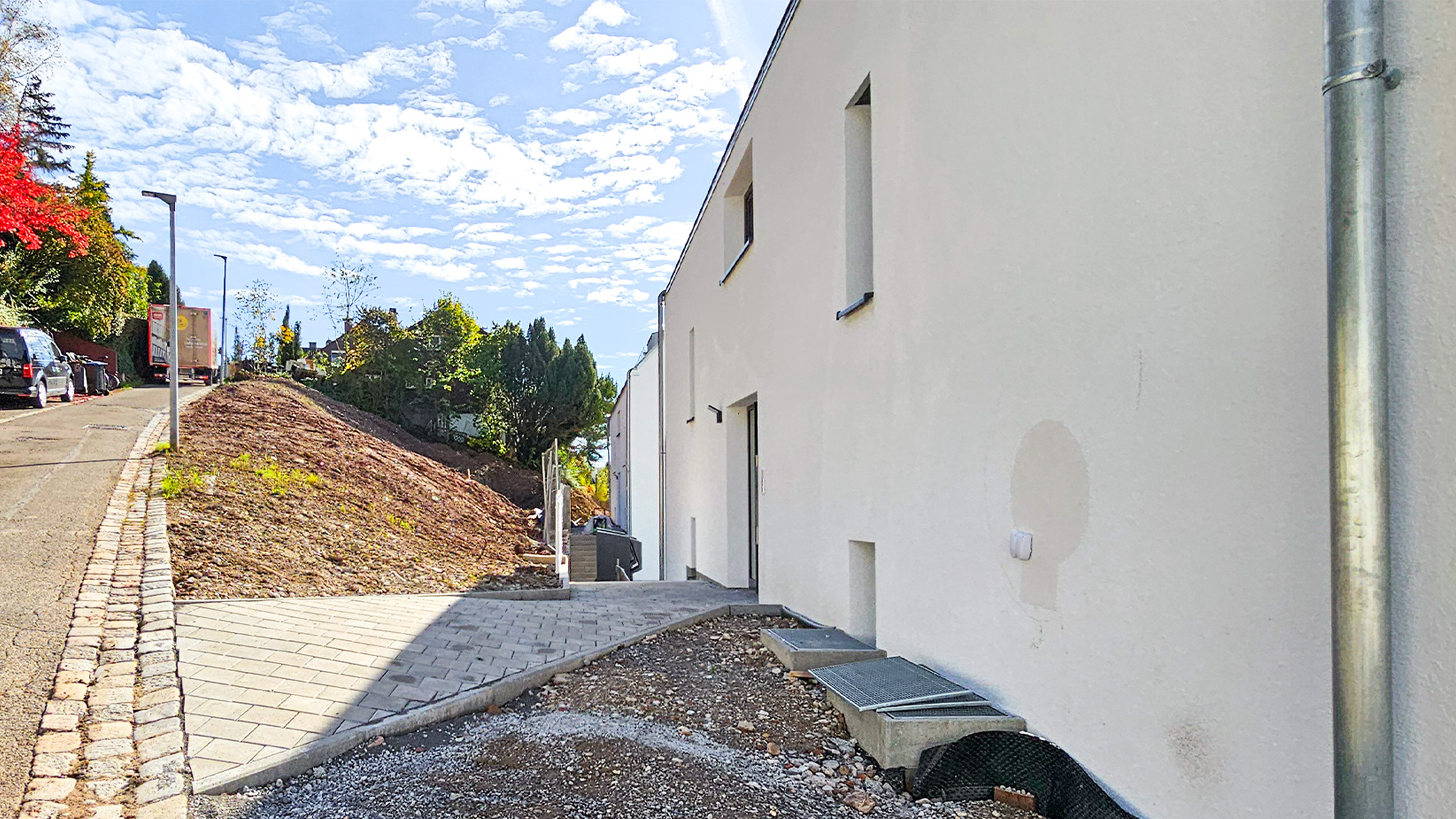 Zunächst wurde der Hangbereich mit schwerem Gerät begradigt und neu modelliert. Im Anschluss errichteten und überarbeiteten wir massive Betonstützwände zur dauerhaften Sicherung des Geländes. Die gesamte Erschließung wurde neu aufgebaut: Gehwege inklusive Entwässerungsrinnen wurden fachgerecht hergestellt und an die bestehende Infrastruktur angeschlossen.